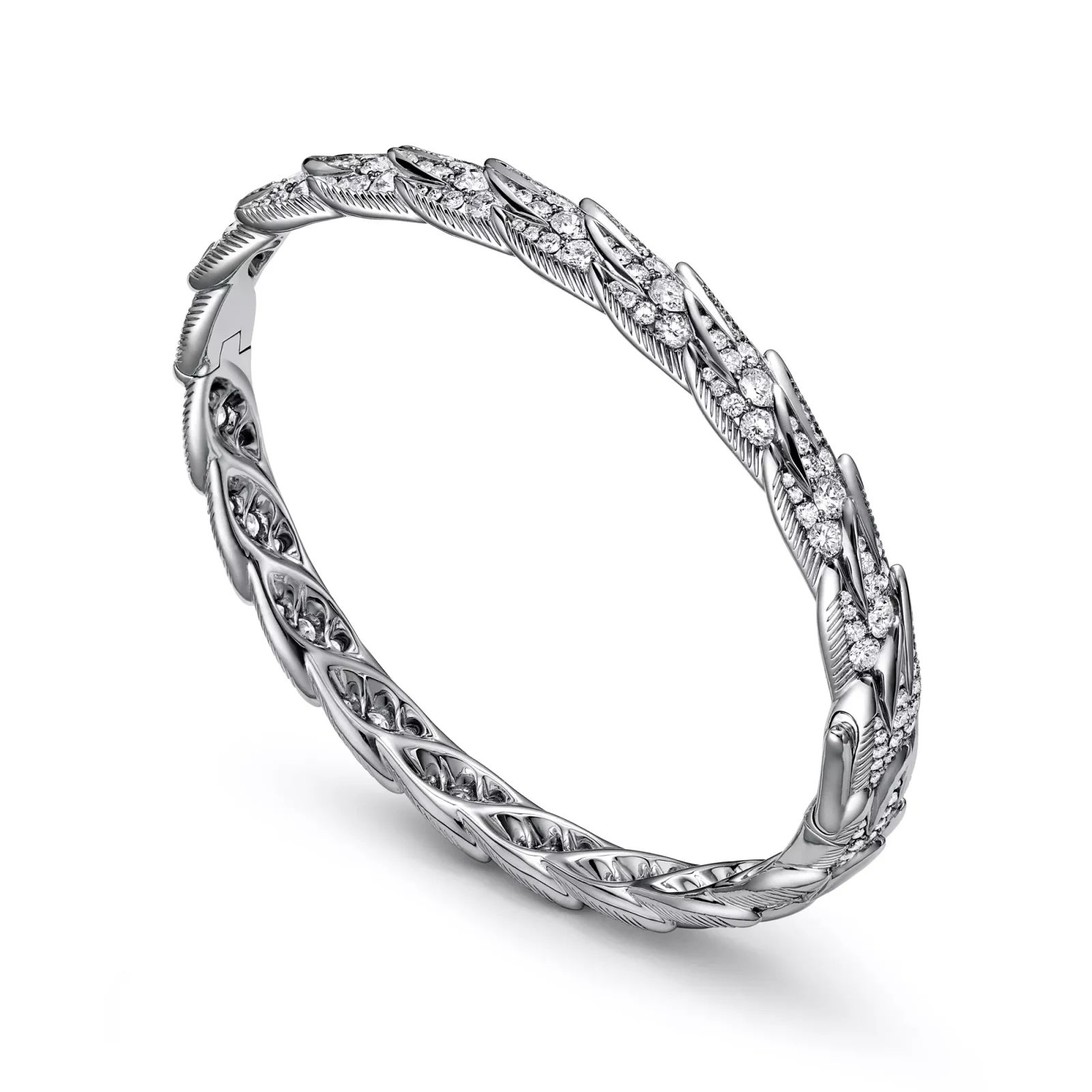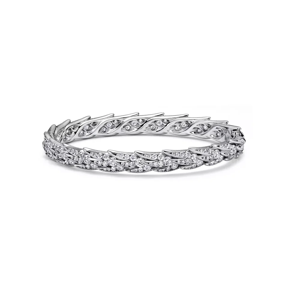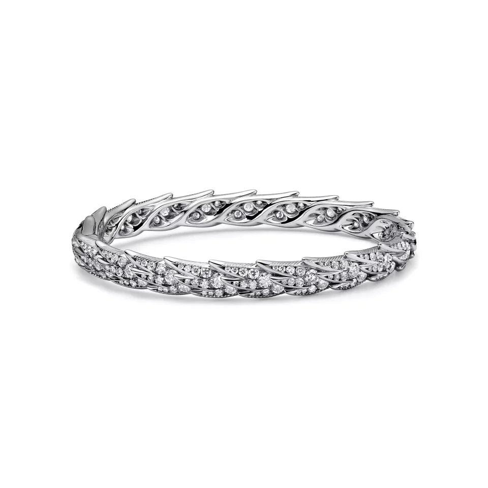 Bird on a Rock is an expression of love’s soaring optimism. This abstract motif has no visible setting, showcasing the purity of the wing as if swept by the wind. Meticulously crafted using specialised high jewellery techniques, this luminous platinum bangle showcases bold, sculptural feathers. Each design captures the graceful movement found in nature, brought to life through a delicate balance of brilliant diamonds and precious metals. When stacked, the edges of one piece perfectly nestle with the feather-shaped silhouette of the other. The motif embraces the avant-garde artistry of Jean Schlumberger’s original Bird on a Rock brooch as it transforms into a bold, textural creation
