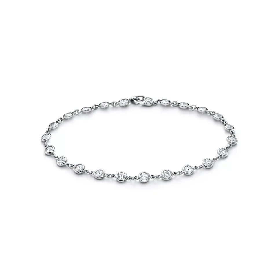 Tiffany round diamonds catch the light and make it dance. Bracelet in platinum with 23 round brilliant diamonds. 7” long. Carat total weight 2.30. Original designs copyrighted by the Nando and Elsa Peretti Foundation.